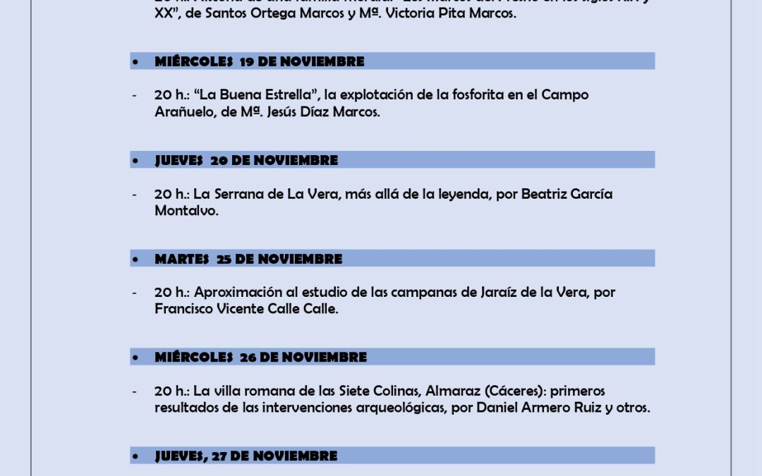 El programa comenzará el lunes 17 de noviembre con la conferencia Luis Agromayor en Extremadura. La visión de un fotógrafo en el noreste cacereño, a cargo de Álvaro Vázquez Cabrera, y la presentación del libro de la pasada edición. Durante la semana se sucederán distintas ponencias dedicadas al patrimonio y la historia del Campo Arañuelo, hasta llegar al jueves 27 de noviembre, jornada de clausura y entrega de premios, que incluirá la intervención Arqueología de Navalmoral de la Mata, de Antonio González Cordero, presentada fuera de concurso.