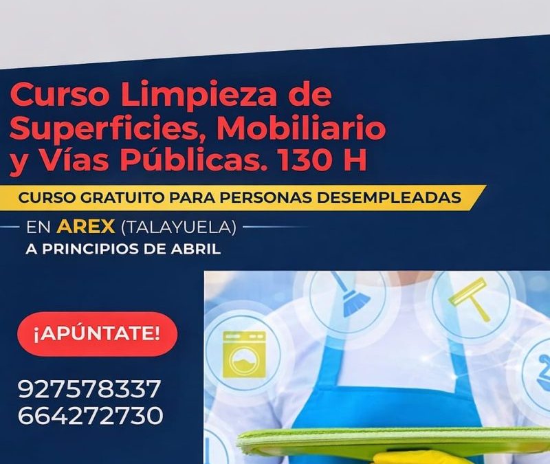 CURSO GRATUITO EN CENTRO DE FORMACIÓN AREX (Talayuela) Dirigido a personas en situación de desempleo. 🧼CRUZ ROJA – PLAN DE EMPLEO Curso: Limpieza de Superficies, Mobiliario y Vías Públicas Duración: 130 horas 📅Inicio previsto: Principios de Abril...
