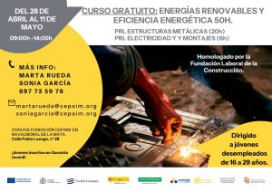 Desde el programa LA RUTA de Fundación Cepaim se oferta el curso gratuito INSTALACIÓN DE ENERGÍAS RENOVABLES Y EFICIENCIA ENERGÉTICA (50h) con PRL DE ESTRUCTURAS METÁLICAS (20h) y PRL DE ELECTRICIDAD (6h)